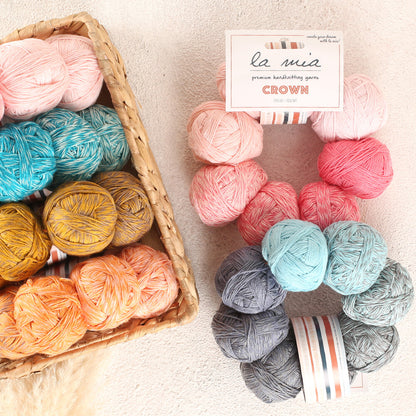 La mia Crown İpleri ile harika tasarımlar yaratın! %50 Pamuk %50 Akrilik içerikli Crown 2 renk akışı ile örgülerinize farklı bir efekt veriyor. Biz 25 gr'lık 8 mini yumak birleşiminden bir taç elde ettik, siz de bu ipi deneyimleyerek yaratıcılığınız ile şahane tasarımlar yaratabilirsiniz.